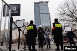 北京市強調,嚴格防疫並非杞人憂天,因為11月上旬一名搭乘包機赴京參加雪橇測試賽的外籍運動員及其密切接觸者就先後被發現染疫,工作人員立刻按照大會頒布的《防疫手冊》啟動應急處置程序,對他們實施隔離監測。北京一個商場的入口處保安查看顧客的手機健康碼。(2021年11月29日)
