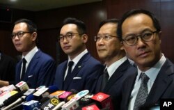 香港四位民主派議員被取消議員資格後在香港立法會與記者見面。(2020年11月11日)