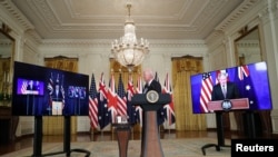 拜登總統與英國首相約翰遜(Boris Johnson)、澳大利亞總理莫里森(Scott Morrison) 9月15號星期三共同宣布,成立一個結合軍事與外交,名為AUKUS的新三方安全倡議,並將支持澳洲核能潛艇巡航印太地區。