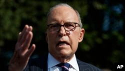 庫德洛對美國之音記者的問題做出回答說,仍有中國貿易談判團隊“9月來此”的計劃。資料照:白宮經濟顧問庫德洛在白宮外對記者談話。(2019年8月6日)
