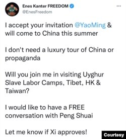 星期三(1月19日),以捍衛自由與人權著稱的美國NBA籃球明星埃內斯·坎特·自由(Enes Kanter Freedom),在個人推特上回應中國籃球明星姚明的公開評論和邀請,稱要到中國參觀維族勞教營、西藏、香港和台灣,還想和彭帥自由對話。
