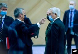 北約秘書長斯托爾滕貝格與俄羅斯副外長格魯什科和副防長副明在布魯塞爾北約總部會談前見面。(2022年1月13日)