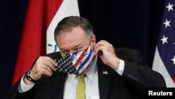 蓬佩奧星期二(2020年9月1日)在福克斯商業頻道“盧·道布斯今夜”(Lou Dobbs)節目中列出了特朗普政府過去一段時間裡具體採取的有關措施,包括限制中國電信商華為公司在美國的運行,關閉被他稱為“間諜窩”的中國駐休斯頓領事館,以及聯邦調查局和司法部調查和起訴美國大學校園裡一些為中國遞送科技情報的人。美國國務卿蓬佩奧2020年8月19日在國務院出席一場活動(路透社)