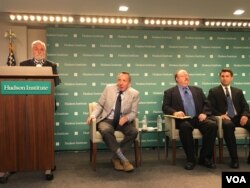 專家討論美國應如何防衛台灣,左起(講台上)加里亞、克洛普西、費舍爾、易思安(美國之音鐘辰芳拍攝 )