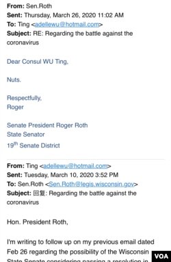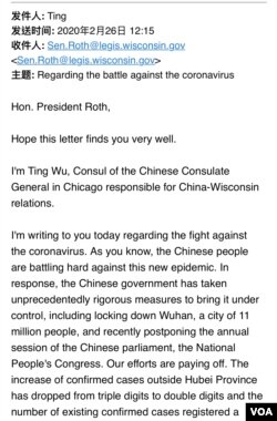 羅斯參議員給美國之音提供的資料顯示,他收到第一封郵件是2月26日,發信人落款WU Ting,在信中自稱“中國駐芝加哥總領事館負責中國與威斯康辛州關係的領事” (Ting Wu, Consul of the Chinese Consulate General in Chicago responsible for China-Wisconsin relations)。