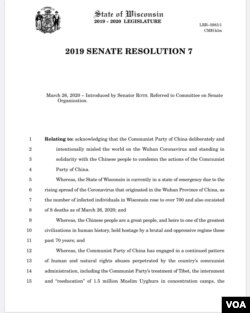 這份決議案首先寫道:“認清中國共產黨在武漢冠狀病毒問題上蓄意地、有目的地誤導了世界,我們堅決跟中國人民站在一起,譴責中國共產黨的各種行為。”