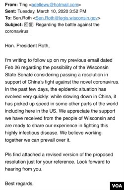 該郵件稱:“尊敬的羅斯議長,我現在致信給您,是為了繼續討論我2月26日發送的那封電子郵件,內容涉及威斯康辛州參議院是否可能考慮通過一項決議案,以支持中國對抗新冠病毒” ,“如果您能認真考慮,將不勝感激。我們已經起草了一份決議草案,僅供您參考。”